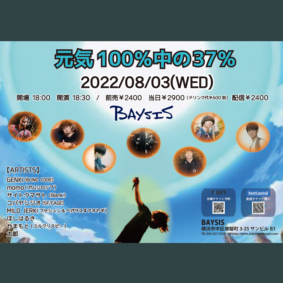 〈会場チケット予約方法〉 ・TIGET予約ページ https://tiget.net/events/188077 【ご予約時ご連絡先入力ご協力のお願い】 BAYSISでは来場者様の情報を控えさていただきます。 感染者が発生した場合など、保健所等から要請があった際は情報提供をさせていただきますので予めご了承下さい。 ※チケット予約時、必ずお名前(本名フルネーム)、電話番号、ご住所の入力をお願いします。 ※規定数に達した時点で予約受付終了となります。 〈配信チケット購入方法〉 ・ツイキャスプレミア配信 https://twitcasting.tv/baysisyokohama/shopcart/162942 ・視聴ページ https://twitcasting.tv/baysisyokohama ※購入時メッセージ欄にお目当てのアーティスト名をご記入ください。 ※ご購入頂いた公演は開演時間になりましたらご視聴可能になります。お時間までお待ちください。